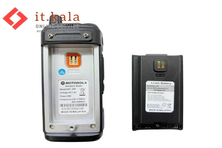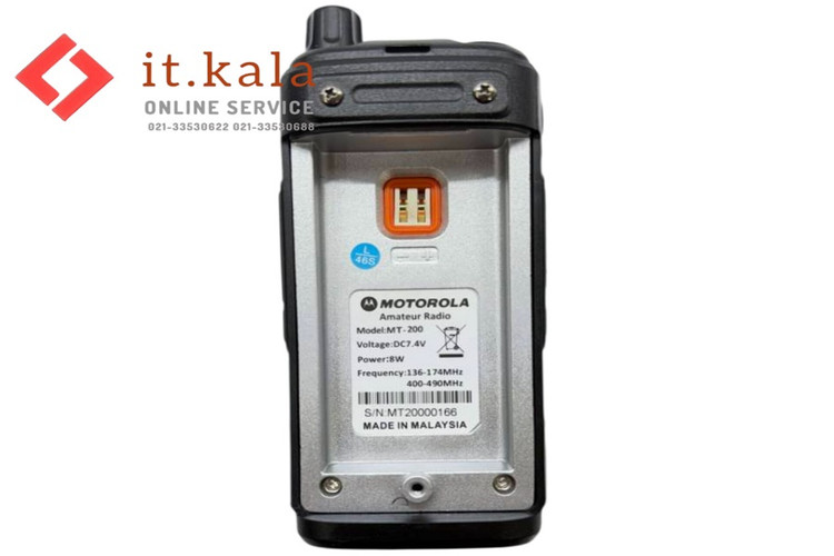 بیسیم واکی تاکی موتورولا مدل MT200 (پک دو عددی) یک بیسیم با توان 10 وات است که از 16 کانال برخوردار بوده و از آنجایی که ساخت کشور مالزی و سنگاپور است، از کیفیت بالایی برخوردار است. این دستگاه بردی حدود 10 تا 12 کیلومتر در داخل شهر و تا 40 کیلومتر در خارج شهر داشته و عملکرد بسیار خودبی در آب و هوای بارانی و حتی گرد و غبار دارد. باند فرکانسی بیسیم واکی تاکی موتورولا مدل MT200 (پک دو عددی) حدود 400-480MHz بوده و دارای یک باتری با ظرفیت 1800 میلی وات است.